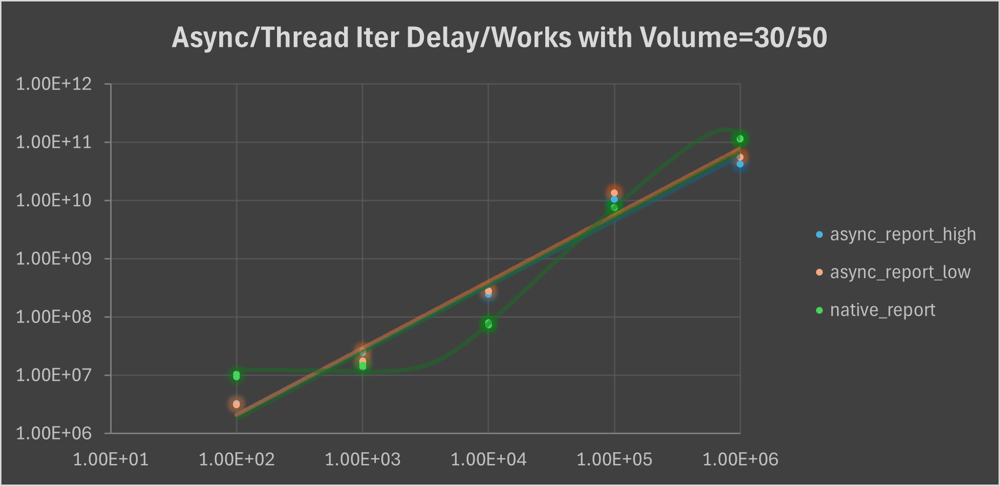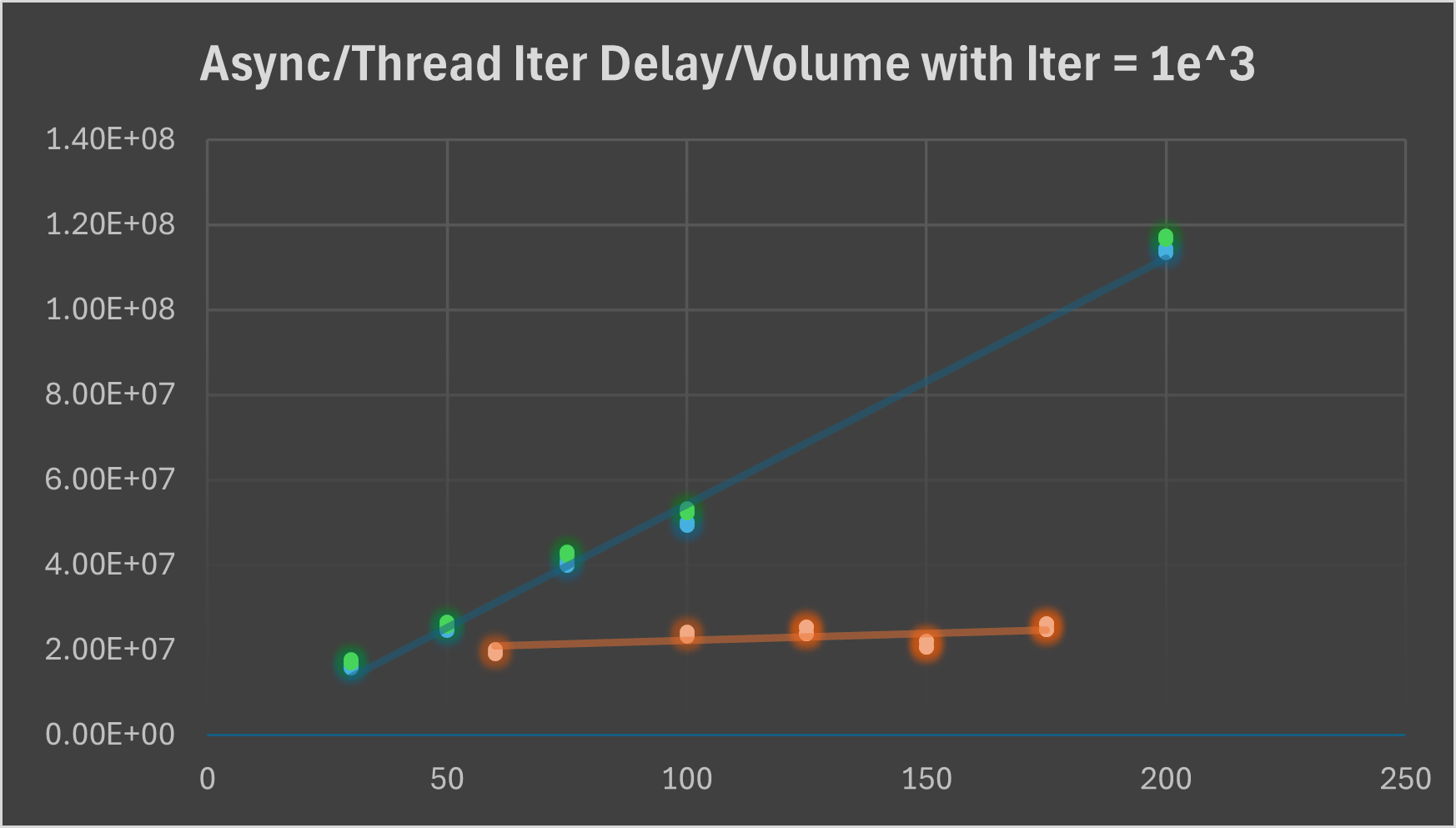 iterations and increase of volume. We see that even the delay of async task is much higher than thread, its iteration counts aren’t curbed.